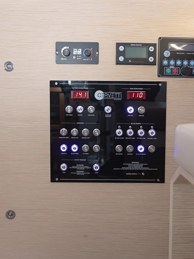 Teak cockpit, Single skippers cabin (portside), Skippers wc and shower (strarboard), Deck courtesy lights in cockpit, transom and flybridge, Teak cockpit table, Dinghy hoist system and electrical winch, Flybridge teak table, Pulpits with wooden seats, Aft deck, cockpit and stern natural teak, 12v 30L fridge in flybridge bench, Gas plancha grill in cockpit, Flybridge, cockpit and sundeck cushions - Faux leather, Windlass control chain counter, Wide flybridge bimini Sunbrella, Second swimming ladder, Fixed bowsprit with anchor roller cradle, Swimming ladders with wide steps, Teak deck, Flybridge Curtains in cabins, Interior courtesy LED lighting, Fans in saloon and cabins (7), Saloon curtains, Electric toilet (4) Drawer 160 Inox freezer, Drawer 320 Combi inox refrigerator, Nespresso coffee machine, Ice maker Services GEL batteries 165A (5), USB sockets in saloon and cabins, 220V Charger + 25m Shore power cable, 220V sockets in all cabins, Generator Fischer Panda (back position), Air conditioning 54K BTU, Solar Panels x 4. total power 992W (on bimini), Inverter 2000 W, Water maker, Air condition in saloon, Air condition in cabins Compass Riviera, Navigation Pack : auto-pilot, 2 instruments, transducer, wind, compass, GPS navigation : Raymarine AXIOM 12 MFD + keyboard MK10 - at helm station, Rear camera connected to Plotter, VHF - at helm station Fusion audio pack Dacron square top full batten mainsail, Lazy jack, Asymmetrical deck fitting (fittings for asymetrical gennaker and additional winch), Electric halyard winch (1), Electric windlass, Lazy bag