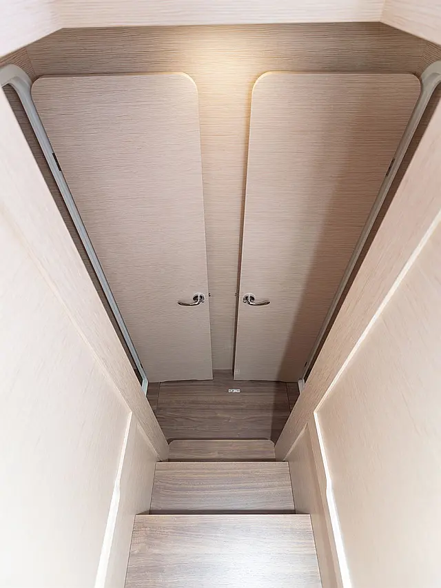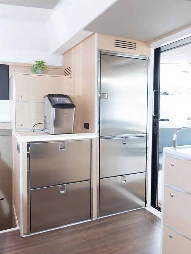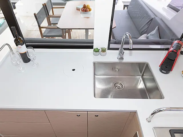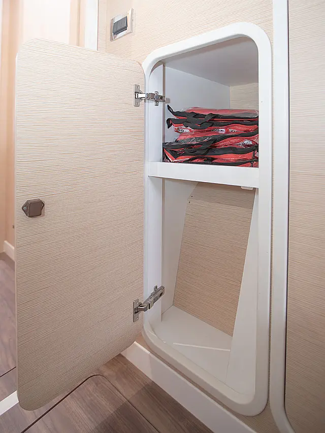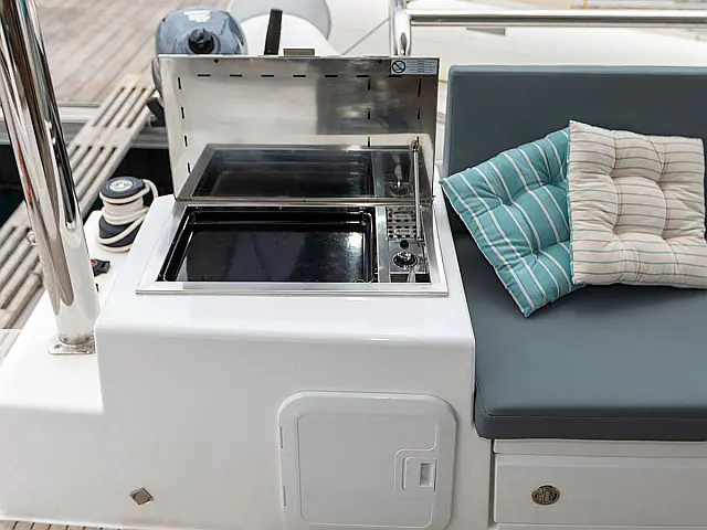 Teak cockpit, Single skippers cabin (portside), Skippers wc and shower (strarboard), Deck courtesy lights in cockpit, transom and flybridge, Teak cockpit table, Dinghy hoist system and electrical winch, Flybridge teak table, Pulpits with wooden seats, Aft deck, cockpit and stern natural teak, 12v 30L fridge in flybridge bench, Gas plancha grill in cockpit, Flybridge, cockpit and sundeck cushions - Faux leather, Windlass control chain counter, Wide flybridge bimini Sunbrella, Second swimming ladder, Fixed bowsprit with anchor roller cradle, Swimming ladders with wide steps, Teak deck, Flybridge Curtains in cabins, Interior courtesy LED lighting, Fans in saloon and cabins (7), Saloon curtains, Electric toilet (4) Drawer 160 Inox freezer, Drawer 320 Combi inox refrigerator, Nespresso coffee machine, Ice maker Services GEL batteries 165A (5), USB sockets in saloon and cabins, 220V Charger + 25m Shore power cable, 220V sockets in all cabins, Generator Fischer Panda (back position), Air conditioning 54K BTU, Solar Panels x 4. total power 992W (on bimini), Inverter 2000 W, Water maker, Air condition in saloon, Air condition in cabins Compass Riviera, Navigation Pack : auto-pilot, 2 instruments, transducer, wind, compass, GPS navigation : Raymarine AXIOM 12 MFD + keyboard MK10 - at helm station, Rear camera connected to Plotter, VHF - at helm station Fusion audio pack Dacron square top full batten mainsail, Lazy jack, Asymmetrical deck fitting (fittings for asymetrical gennaker and additional winch), Electric halyard winch (1), Electric windlass, Lazy bag